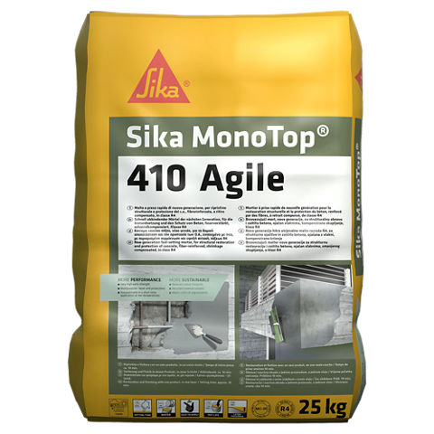 Sika MonoTop®-410 Agile è una malta monocomponente R4 PCC a presa rapida (10 min) e granulometria fine, premiscelata, additivata con polimeri, caratterizzata da una formulazione sostenibile a ridotta emissione di CO2, reologia e lavorabilità innovative, unite ad un bassissimo ritiro, per il ripristino, la protezione contro la corrosione delle armature e la rasatura protettiva di elementi in calcestruzzo. Contiene cementi modificati con polimeri sintetici, fumi di silice, aggregati selezionati e fibre sintetiche.