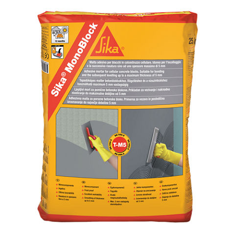 Sika® MonoBlock è una malta premiscelata monocomponente a base di cementi ad alta resistenza, cariche minerali silicio/quarzose selezionate e da additivi specifici per blocchi in calcestruzzo cellulare.