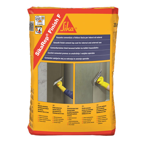Rasatura superficiale cementizia, monocomponente, per interni ed esterni, con finitura liscia di colore bianco o grigio per spessori fino a 4 mm.