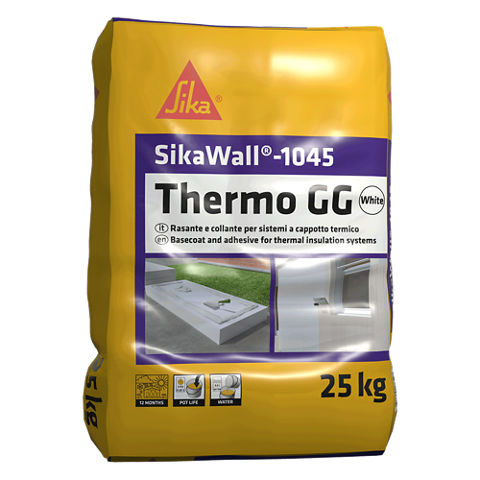 SikaWall®-1045 Thermo GG è una malta cementizia monocomponente per l'incollaggio e la rasatura di pannelli isolanti nei sistemi di isolamento a cappotto esterno Sikatherm®. SikaWall®-1045 Thermo GG viene impiegato per incollare i pannelli in EPS, EPS grafite, poliuretano, lana di roccia.