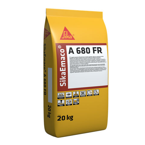 SikaEmaco® A 680 FR è uno speciale legante espansivo rinforzato con fibre di acciaio ad elevata trazione e ancoraggio, dotate di un rivestimento galvanico anticorrosione eco-compatibile e caratterizzate da lunghezza 30 mm, spessore = 0,38 mm, rapporto d'aspetto L/D = 80, resistenza a trazione > 2800 MPa, modulo elastico a trazione 210000 MPa. Tale legante mescolato con sabbia, aggregati ed acqua, come per un normale conglomerato cementizio, consente di ottenere calcestruzzi a ritiro compensato, reoplastici, pompabili, non segregabili, ad alta resistenza meccanica, durevoli rispetto agli agenti aggressivi dell’ambiente, senza dover ricorrere all'ulteriore aggiunta di altri additivi e all'applicazione in situ della rete di contrasto.