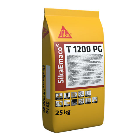 SikaEmaco® T 1200 PG è una malta cementizia colabile, a rapido indurimento anche a basse temperature (fino a - 10°C), basata su tecnologia CSA (cemento solfo-alluminoso). Il materiale può essere applicato con consistenza reoplastica o reodinamica a seconda della quantità d’acqua di impasto in funzione della tipologia di applicazione da effettuarsi (per esempio applicazioni in pendenza). L’innovativa formulazione crea una sorta di “serbatoio di acqua interno” a lento rilascio che permette una migliore maturazione riducendo drasticamente la tendenza alla fessurazione. SikaEmaco® T 1200 PG è strutturale ad alte prestazioni (classe R4), colabile in spessori tra 10-150 mm su aree carrabili a rapida rimessa in esercizio. SikaEmaco® T 1200 PG offre una barriera protettiva per le armature minimizzando il rischio di corrosione, consentendo una maggior durabilità dell’intervento di ripristino.