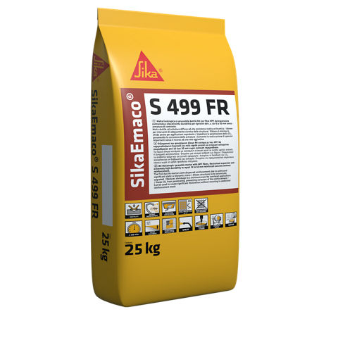 SikaEmaco® S 499 FR è una malta cementizia (CC), tixotropica, ad espansione contrastata in aria, resistente agli agenti aggressivi dell’ambiente, spruzzabile, contenente fibre PAN (poliacrilonitrile) e rinforzata con fibre polimeriche HPF ad altissima tenacità. In assenza di maturazione umida, condizione non sempre realizzabile in cantiere, per migliorare l’espansione all’aria di SikaEmaco® S 499 FR, è possibile aggiungere il componente B (SikaEmaco® A 400). Tale additivo permette di ridurre il ritiro in fase plastica ed igrometrico migliorando la stagionatura.