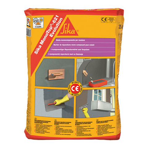 Sika MonoTop®-621 Evolution è una malta premiscelata fibrorinforzata, a base di resine sintetiche, leganti modificati ed additivi speciali. La presenza di resine modificate, fibre sintetiche e particelle fini di aggregato di dimensioni selezionate aumenta le proprietà adesive della malta: questa formulazione consente adesione ottimale su substrati eterogenei, anche in presenza di residui di vernice di diversa natura chimica. Sika MonoTop®-621 Evolution è disponibile nel colore grigio.
