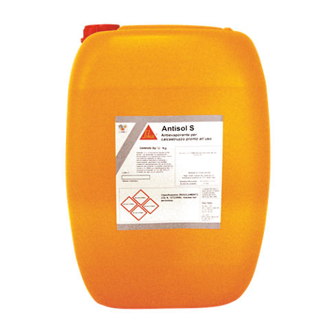 Sika® Antisol® S è un prodotto formulato per essere utilizzato con estrema facilità e rapidità applicativa. Una volta applicato sul calcestruzzo o sulla malta Sika® Antisol® S forma un film continuo che impedisce l'evaporazione dell'acqua e ne protegge la superficie. I pori capillari superficiali dell'impasto vengono chiusi e quindi l'uscita dell'acqua è fortemente limitata anche in presenza di radiazioni solari intense o di vento. Il calcestruzzo risulta protetto dal rapido essiccamento superficiale e si evita così lo sviluppo di polverosità superficiale del calcestruzzo indurito e le classiche fessurazioni dovute ad elevato ritiro plastico. Le resistenze meccaniche e la resistenza all'abrasione sono decisamente migliori se paragonate ad un calcestruzzo non trattato. Inoltre, una volta essiccato e formato il film protettivo superficiale, il calcestruzzo fresco è parzialmente protetto dalla pioggia o da altre deboli azioni dilavanti.
